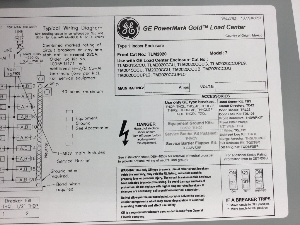 GE Main Breaker 200 Amp 20/40 Spaces