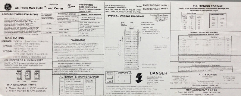 GE TM3215R64K 150 Amp 32 Space/64 Circuit 1PH 3 Wire 120/240V Load Center