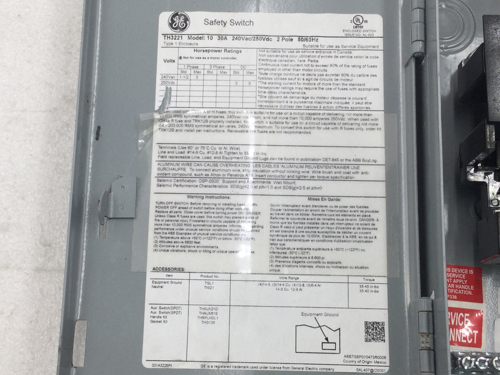 General Electric TH3221 30 Amp 2 Pole 3 Phase 120/240V Fusible Safety Switch