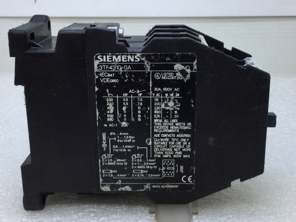 Siemens 3TF4310-0A Magnetic Contactor 3-Phase AC 30 Amp 600V AC