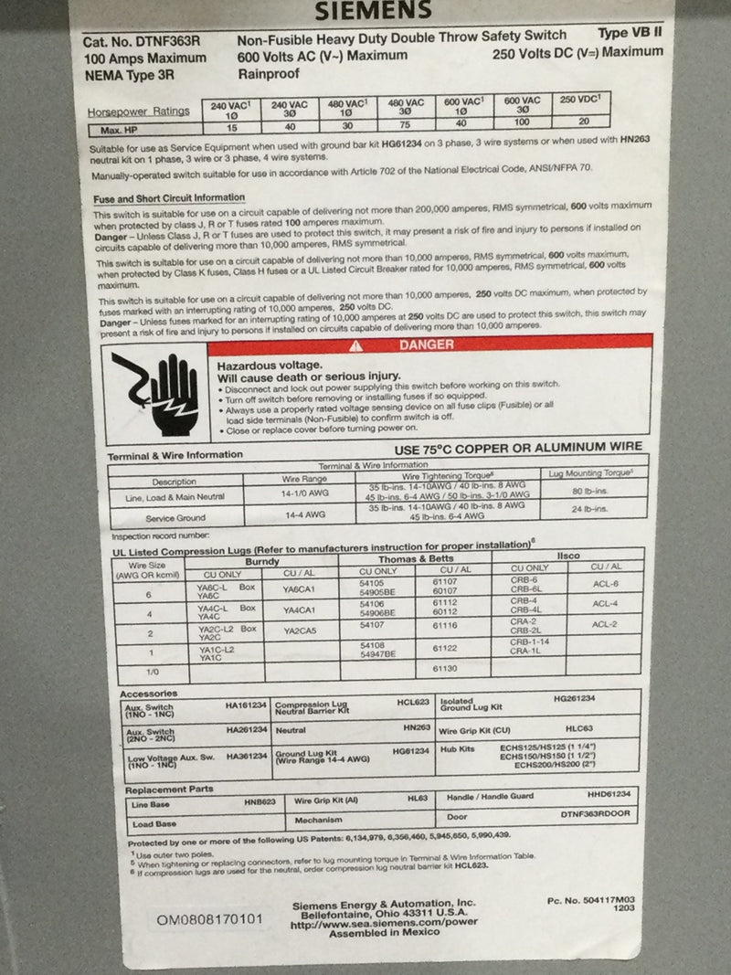 The Siemens DTNF363R is an outdoor 600-volt 3R safety switch, featuring a 100-amp capacity with a double-throw design for increased reliability. It offers superior UL-listed protection for circuits and loads in commercial and industrial settings.