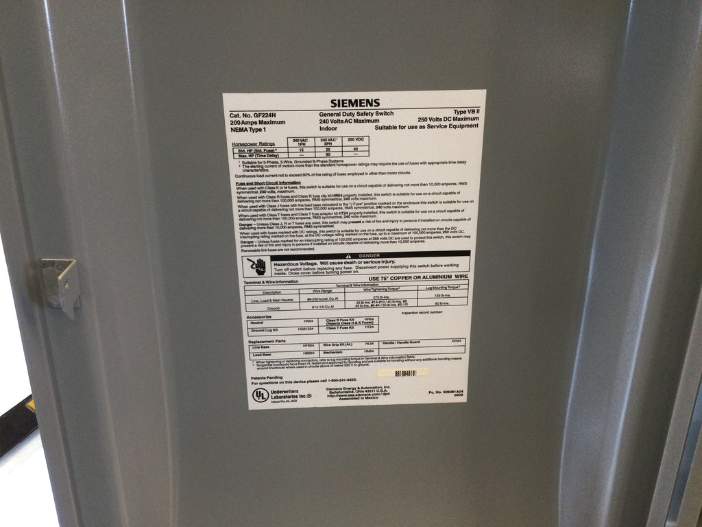 Siemens GF224N General Duty Safety Switch 200 AMP, 2 POLE, 240 VOLT GF224N