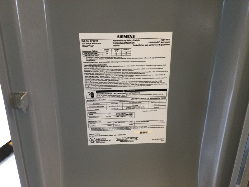 Siemens Gf224n General Duty Safety Switch 200a, 2p, 240v Gf224n