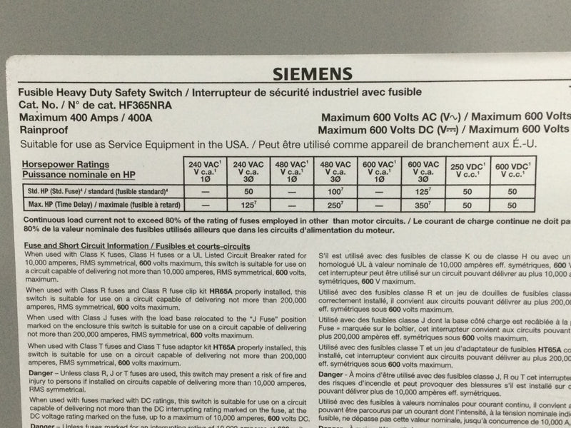 Siemens HF365NRA heavy duty safety switch offers up to 400 amp 600V of reliable power protection. Its 100 kA short circuit current rating provides superior safety and numerous design features ensure easy installation and maintenance. It is UL 98 listed and meets both NEMA and IEC requirements.