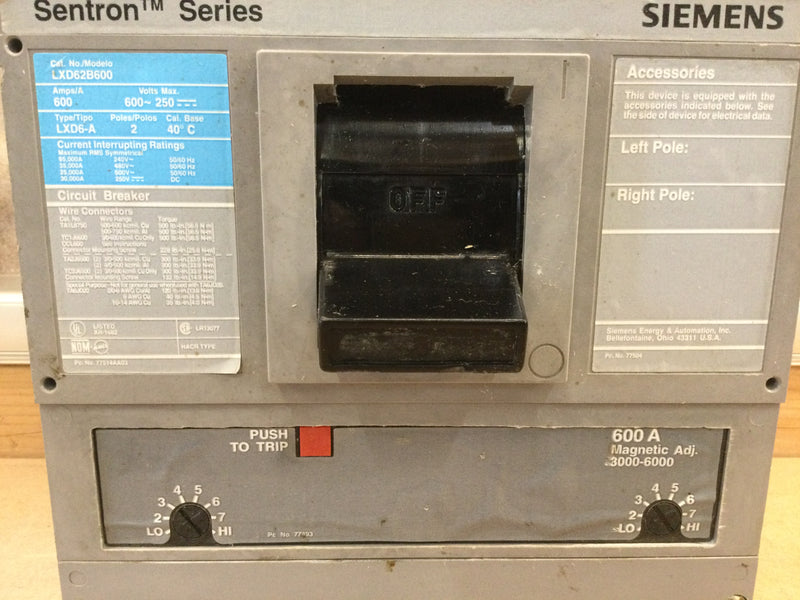Siemens Lxd62b600, 600 Amp 2 Pole 240vac/250vdc Circuit Breaker