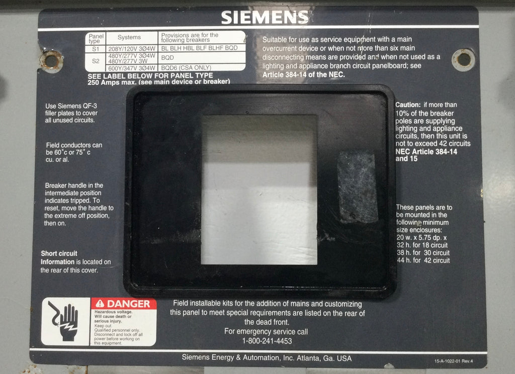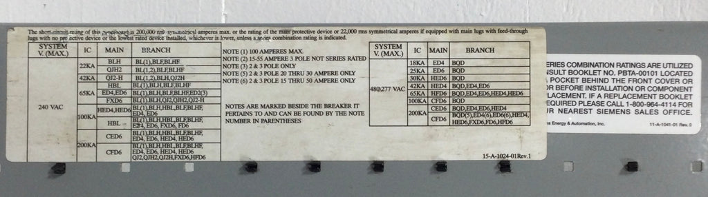Siemens S1CA42LH100CTF 42 Space 250 Amp Dead Front w/Main 36" x 12 3/4"