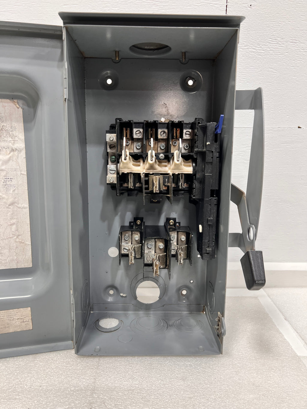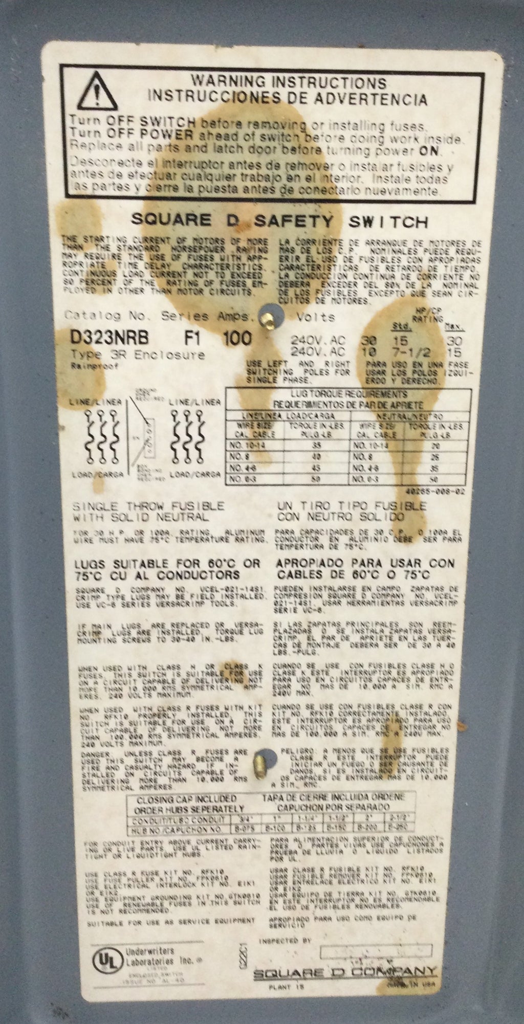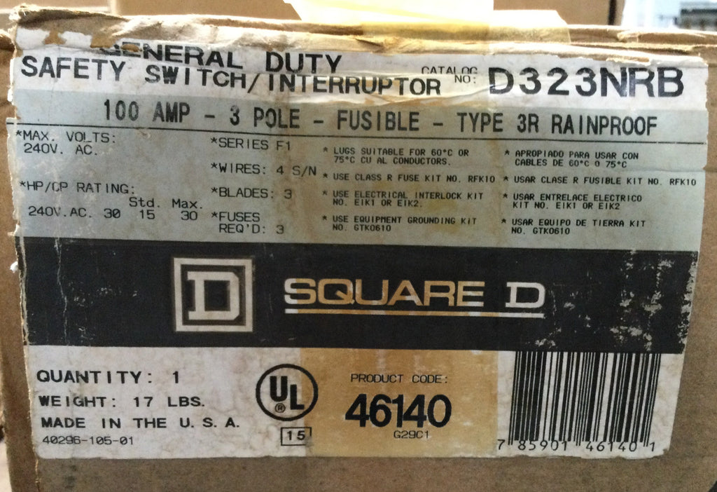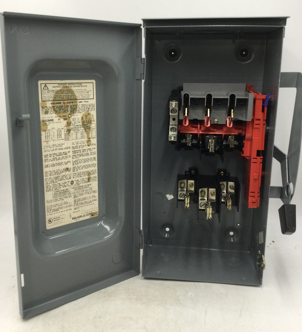 Square D D323NRB Safety switch, general duty, fusible, 100A, 3 pole, 30hp, 240VAC, NEMA 3R, 4 wire, 1 neutral, bolt on hub provision