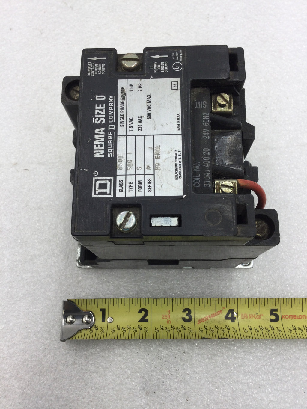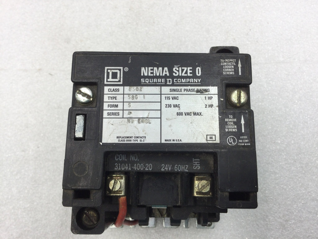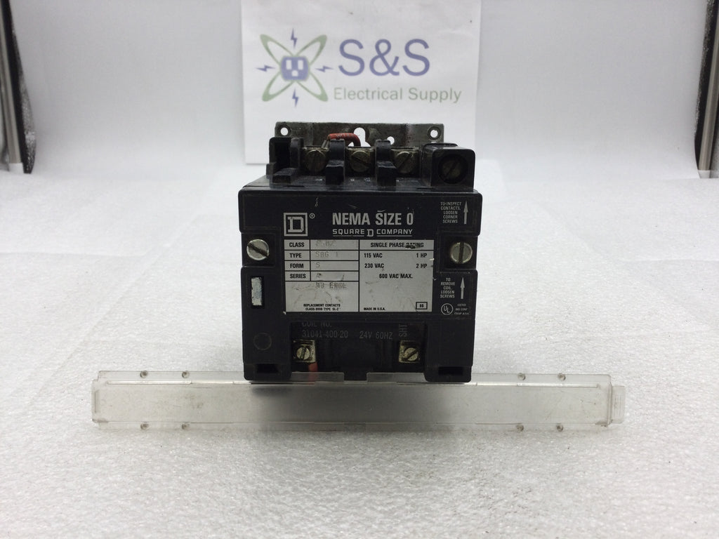Square D 8502SBG1 Nema Size 0 Starter/Contactor 2 Pole 115/230 VAC 1-2 HP with 24 VAC Coil and without Overload Relay