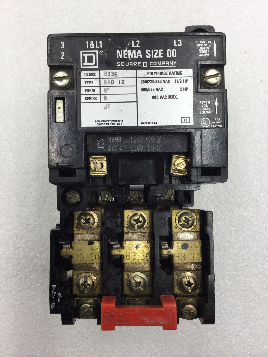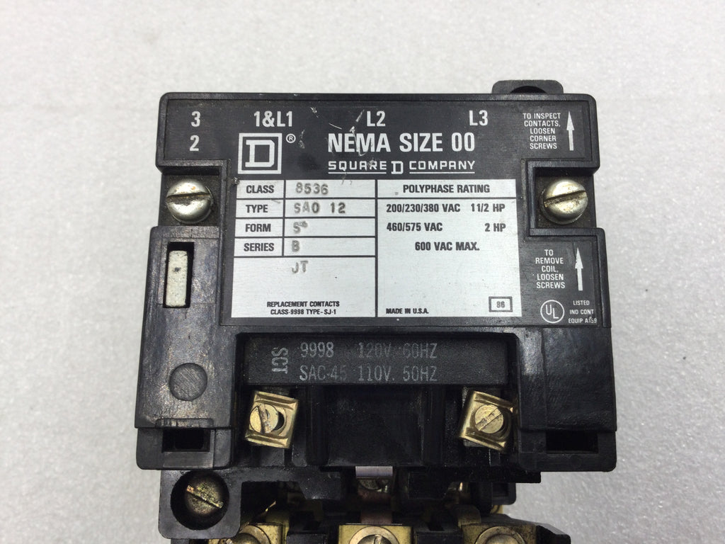 Square D 8536 SAO12 Nema Size 00 Starter 3 Phase 200-575 VAC 1 1/2-2 HP with 120 VAC Coil
