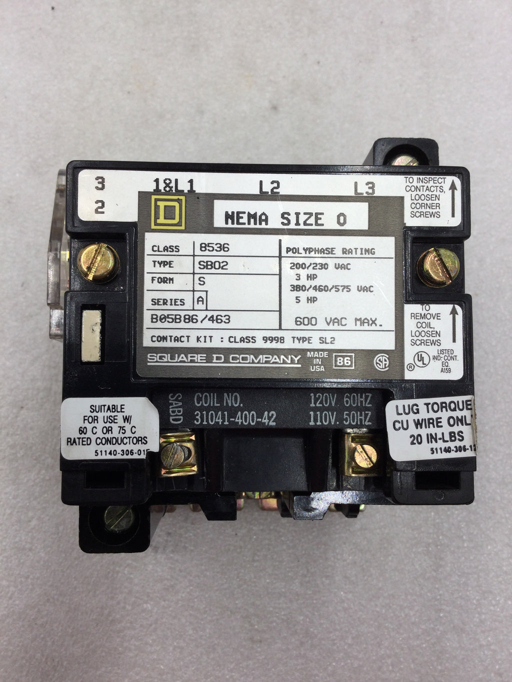 Square D 8536 SB0-2 Size 0 200-575 VAC Contactor 110-120 VAC Coil without Overload Relay and Rest Switch