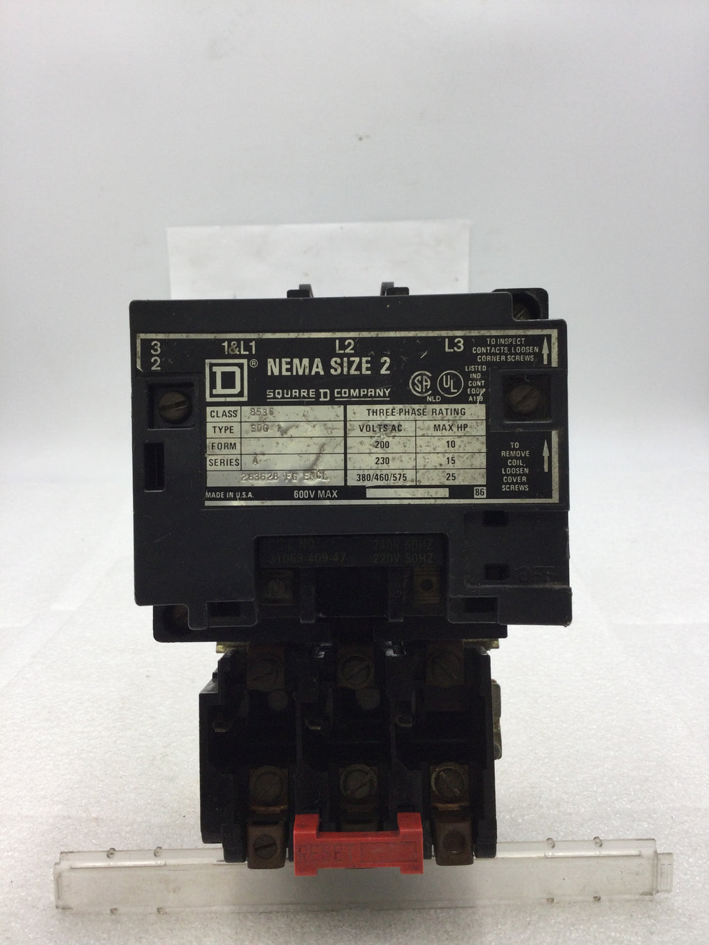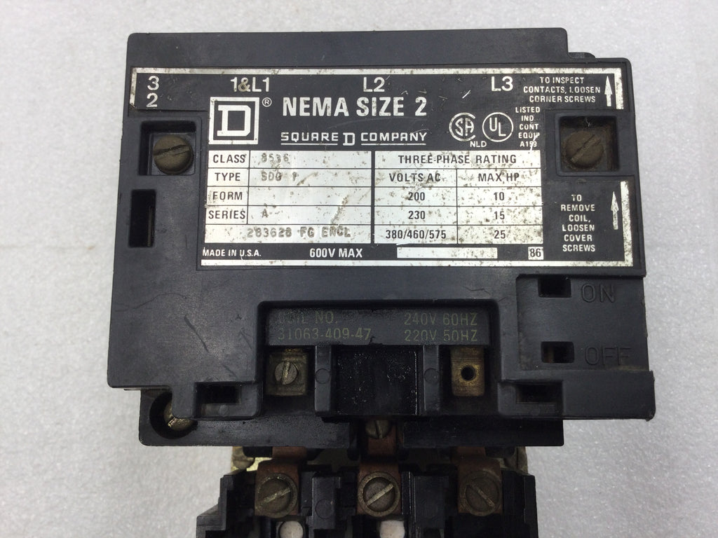 Square D 8536 SDG-1 3 Phase Size 2 Ser A Contactor/Starter 200-575 VAC 10-25 HP with 240 VAC Coil and Overload Relay