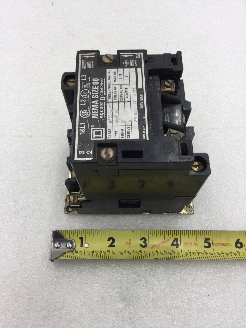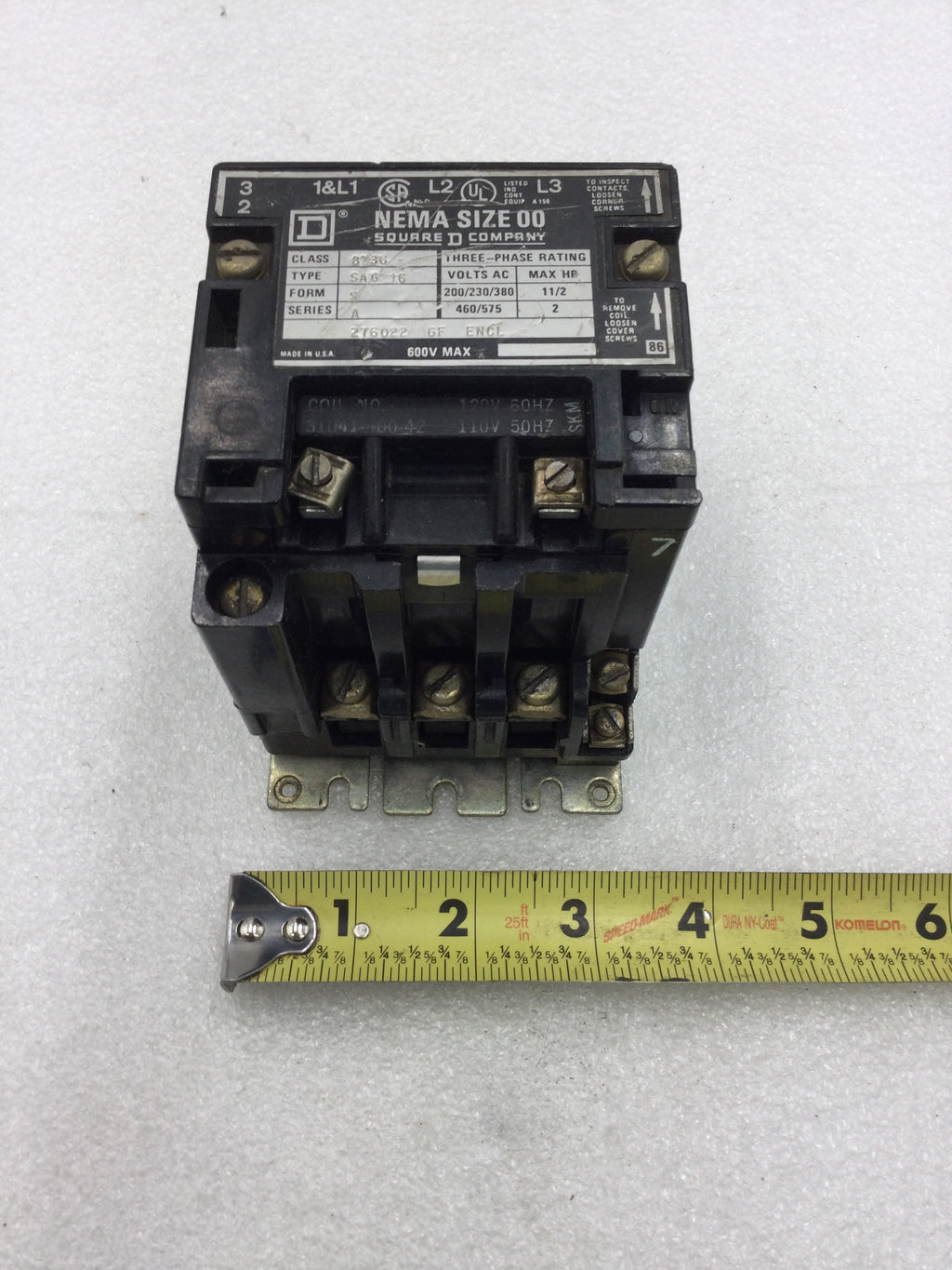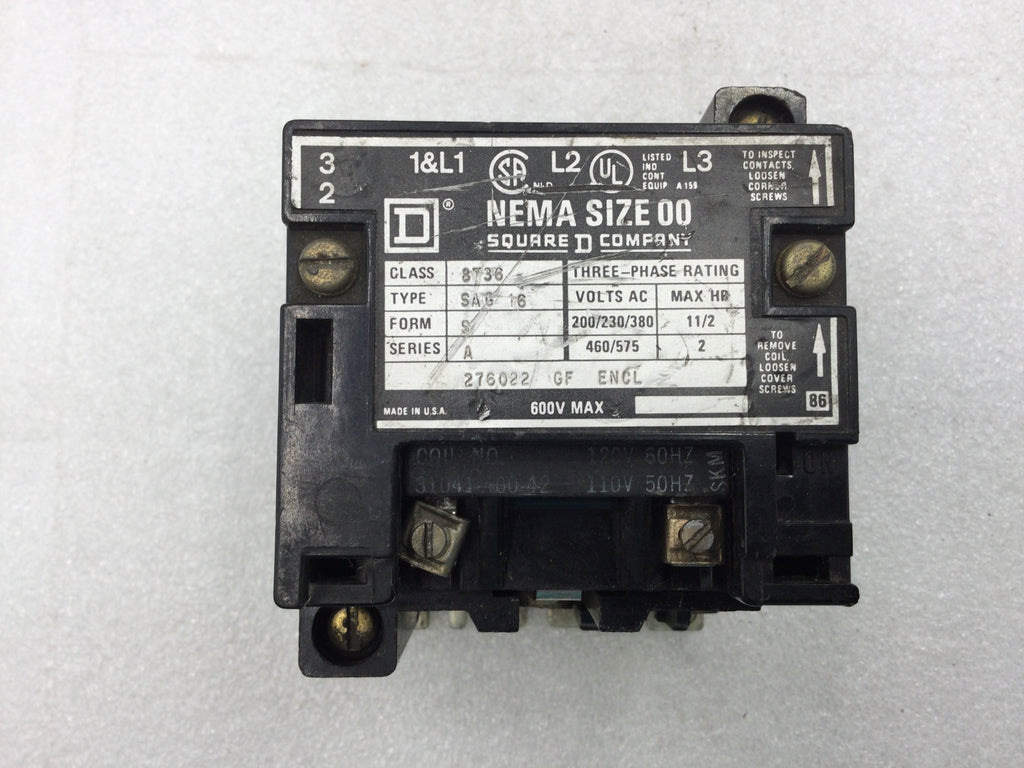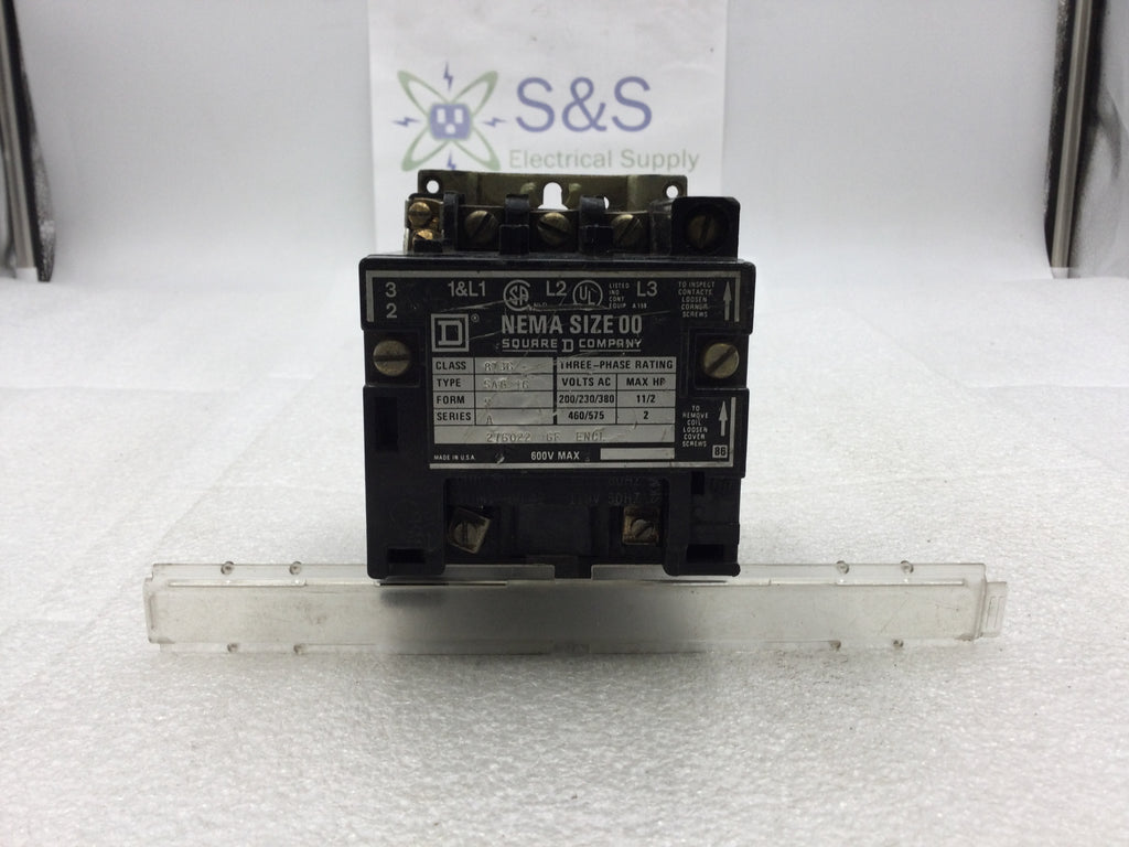 Square D 8536SAG16 Nema Size 00 Starter/Contactor 3 Pole 200-575 VAC 1 1/2-2 HP with 120 VAC Coil and Without Overload Relay