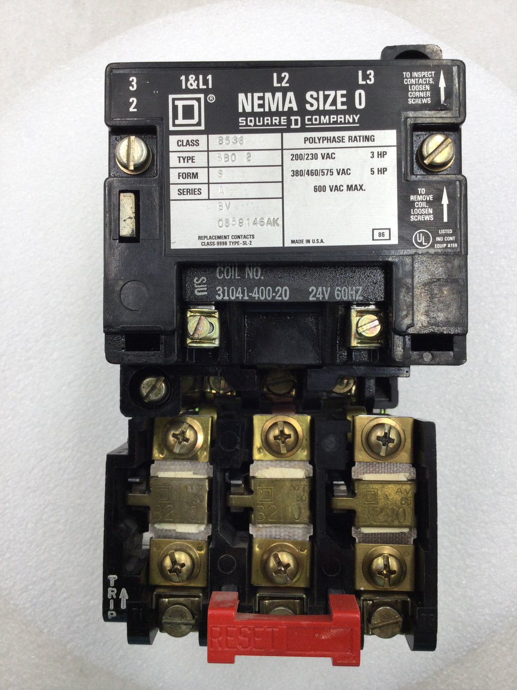 Square D 8536 SBO-2 Size 0 600V 3 Phase Contactor 24 VAC Coil w/Overload Relay