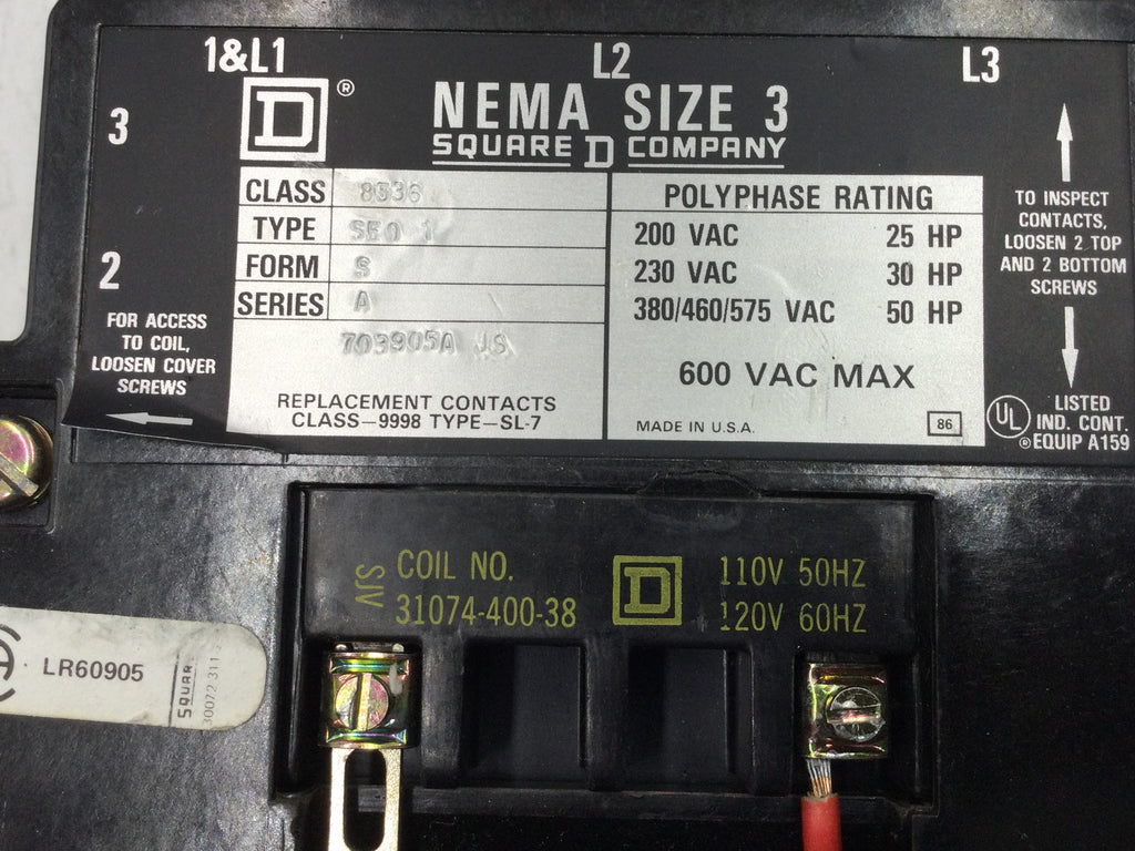 Square D 8536SE01SA Motor Starter 600VAC Max. NEMA Size 3