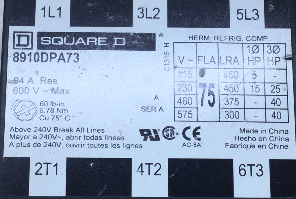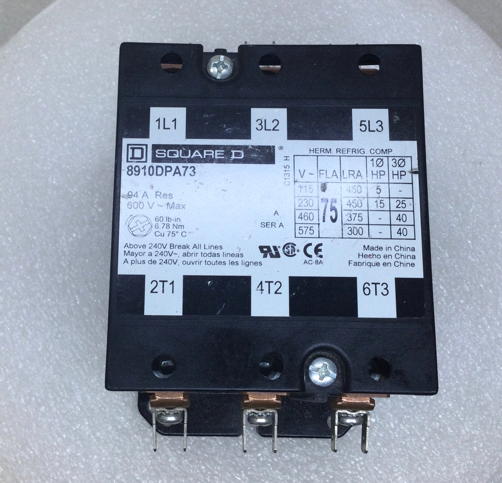 Square D 8910DPA73 94 Amp 3-Pole 600V Definite Contactor
