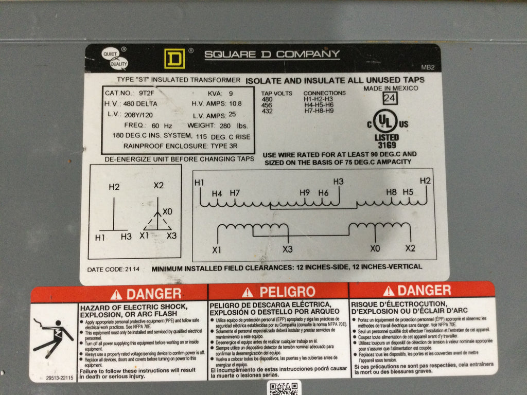 Square D 92TF 3 Phase 9kVA 480VAC Delta @ 10.8A Primary/208Y/120VAC X @ 25A Secondary