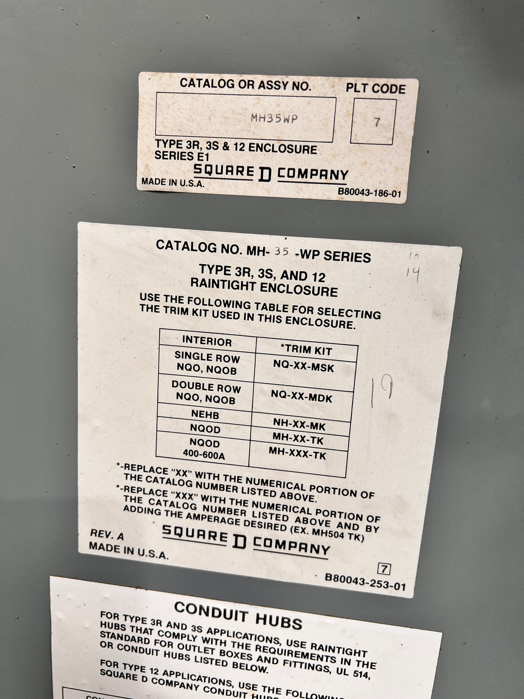 Square D Enclosure MH35WP w/Panel Board 120/208vac 225 Amp 3 Phase 4 Wire 42 Space