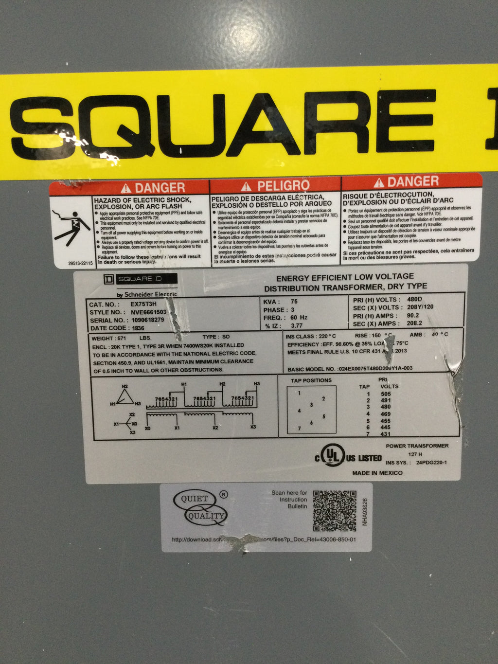 Square D EX76T3H 3 Phase 75kVA 480V Delta @ 90A Primary/208Y/120V @ 208A Secondary