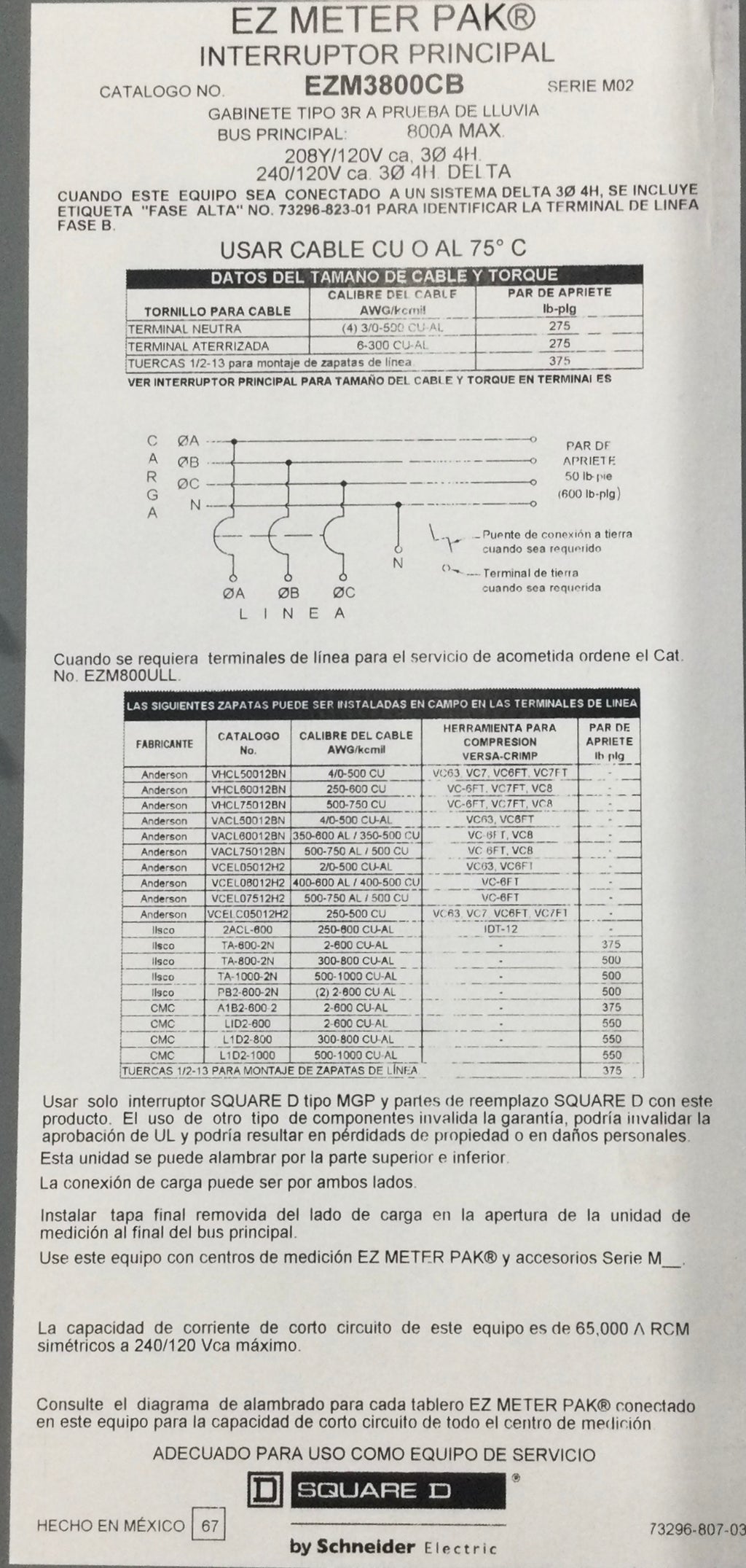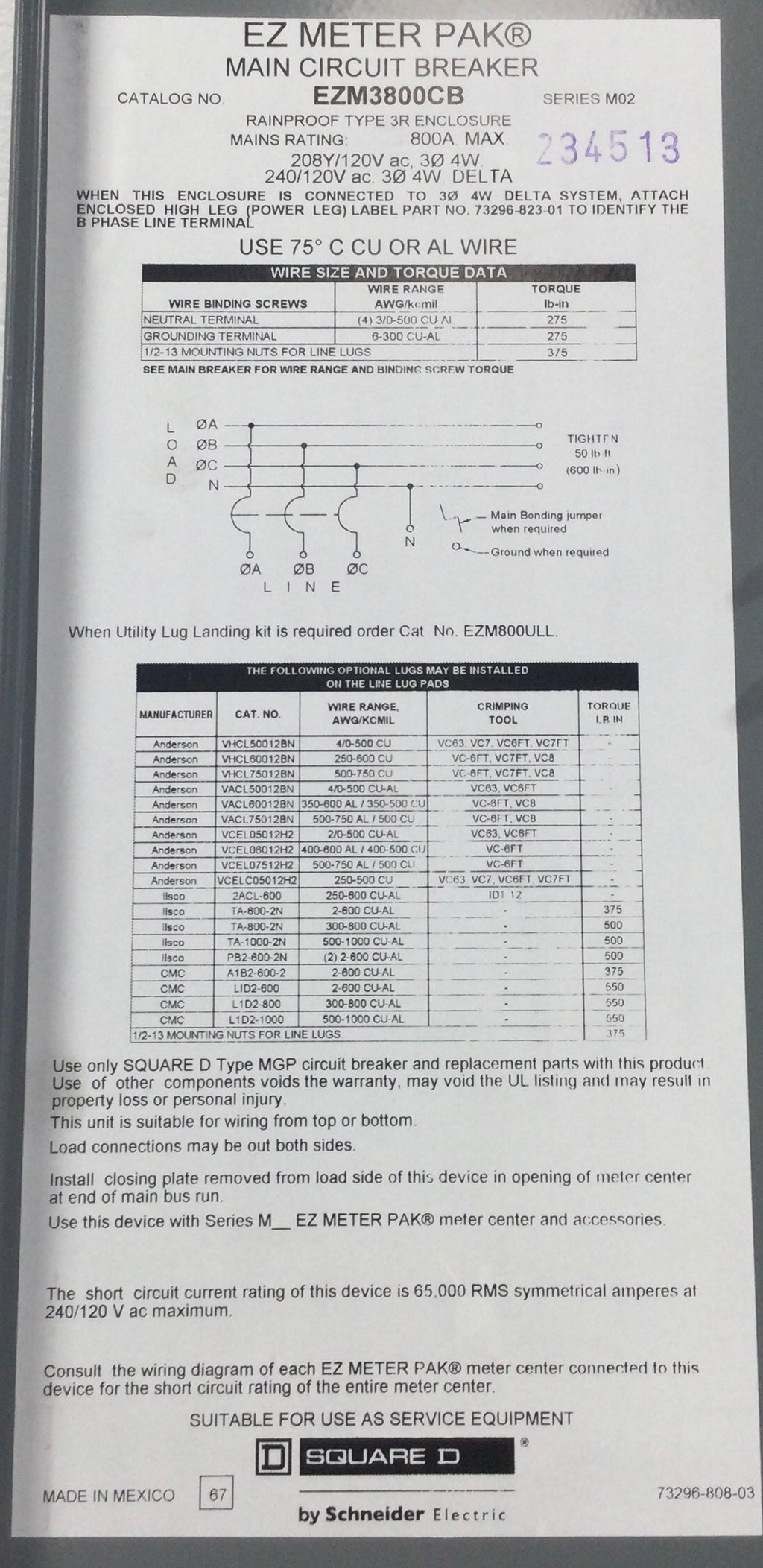 Introducing the Square D EZM3800CB 800 Amp 3-Phase 240V Panelboard - the efficient and reliable solution for all your industrial power needs. With its 240V three-phase system, this panelboard delivers top-notch performance and can handle up to 800 amps. Trust in Square D for high-quality, advanced power distribution.