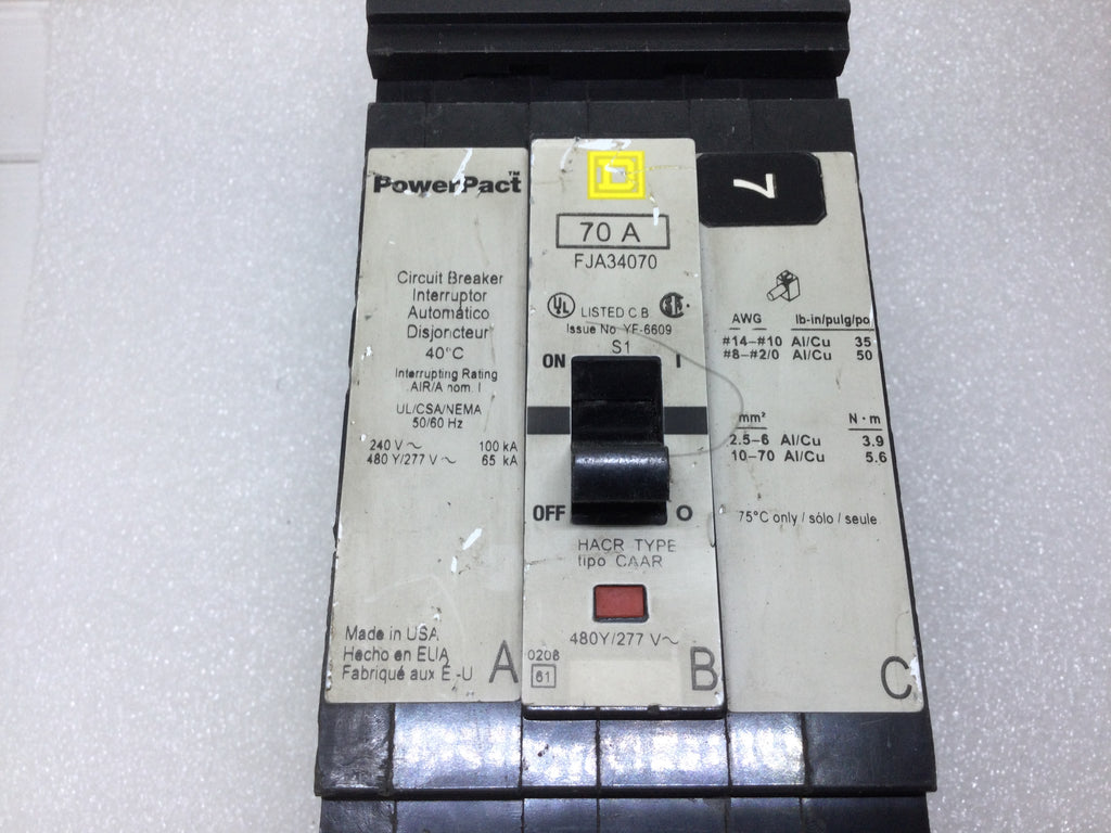 Square D PowerPact FJA34070 3 Pole 70 Amp 480Y/277V Type FJA I Line Circuit Breaker