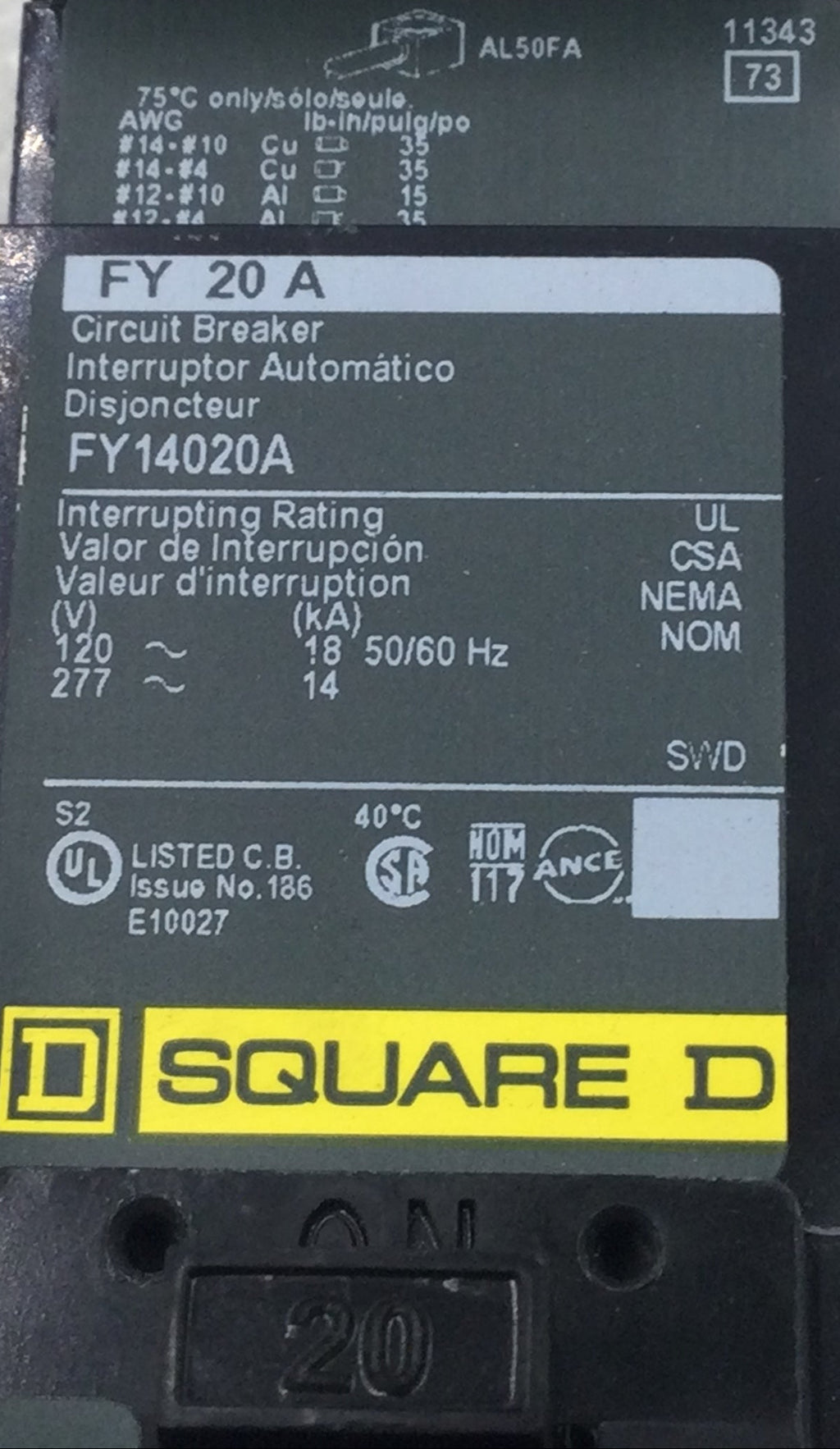Square D FY14020A 20 Amp 1 Pole 277V I-Line Type FY Circuit Breaker