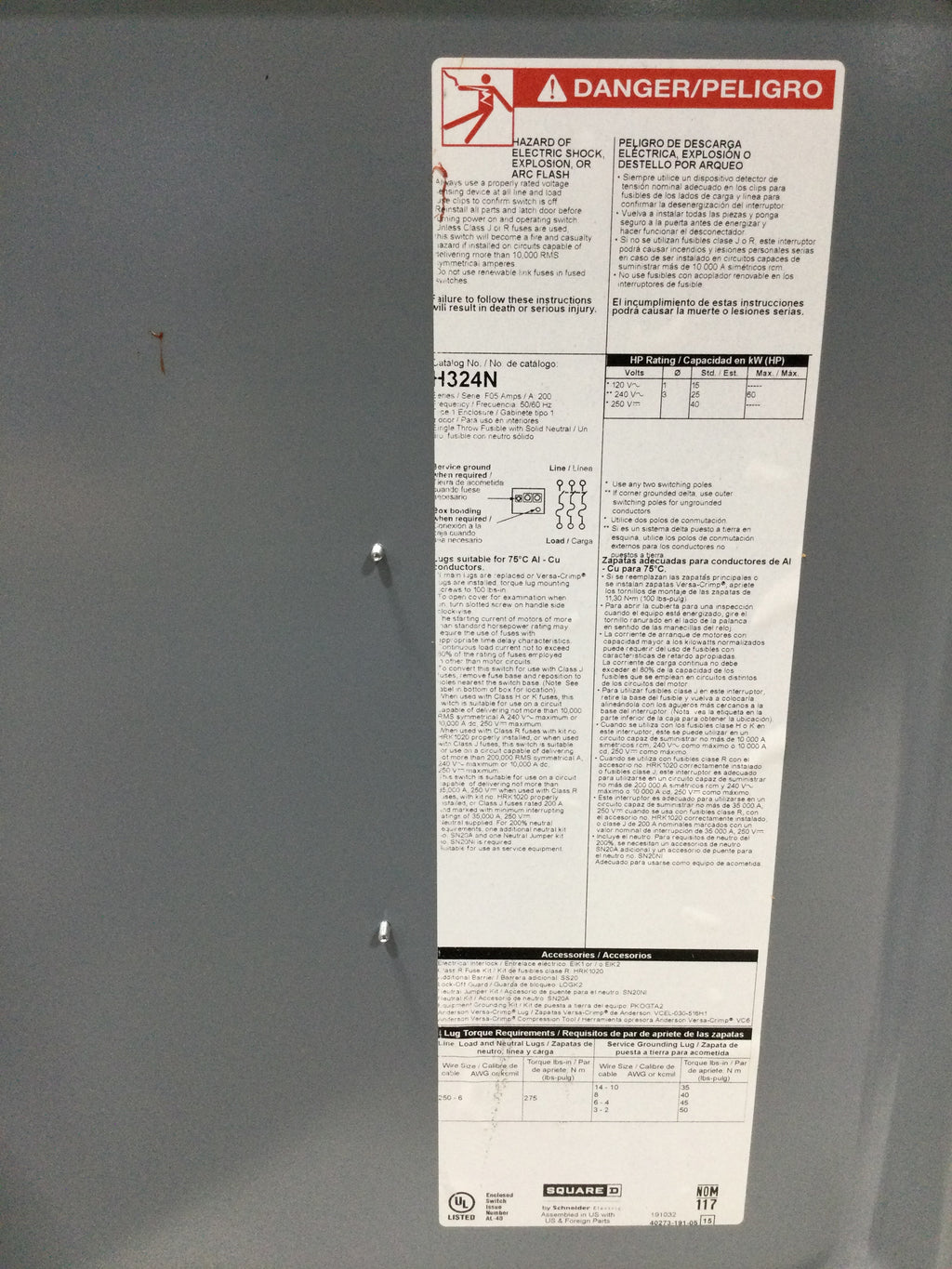 H324N - Safety switch, heavy duty, fusible, 200A, 4 wire, 3 pole, 1 neutral, 60hp, 240VAC/250VDC, NEMA 1 | Schneider Electric USA (se.com)