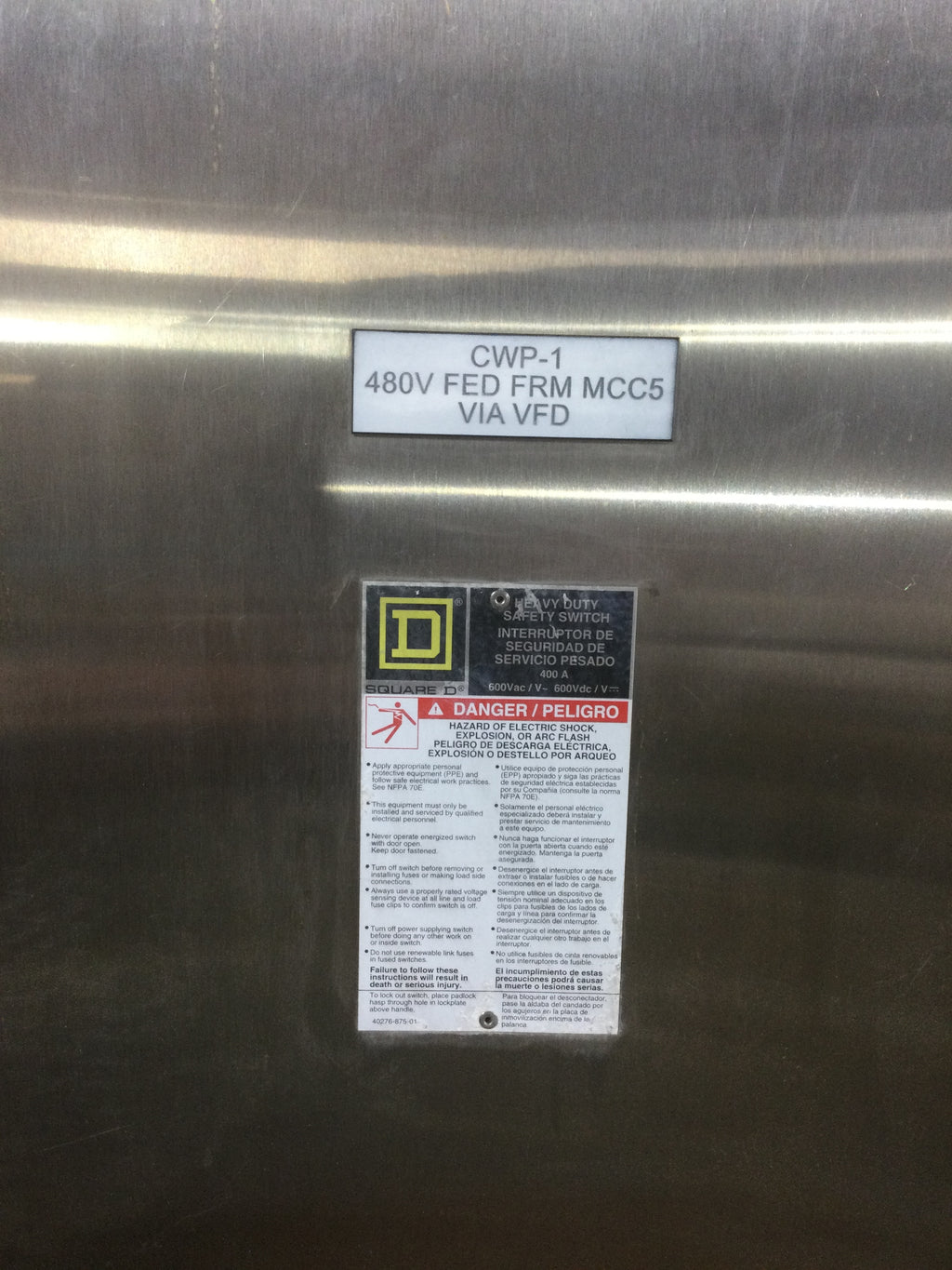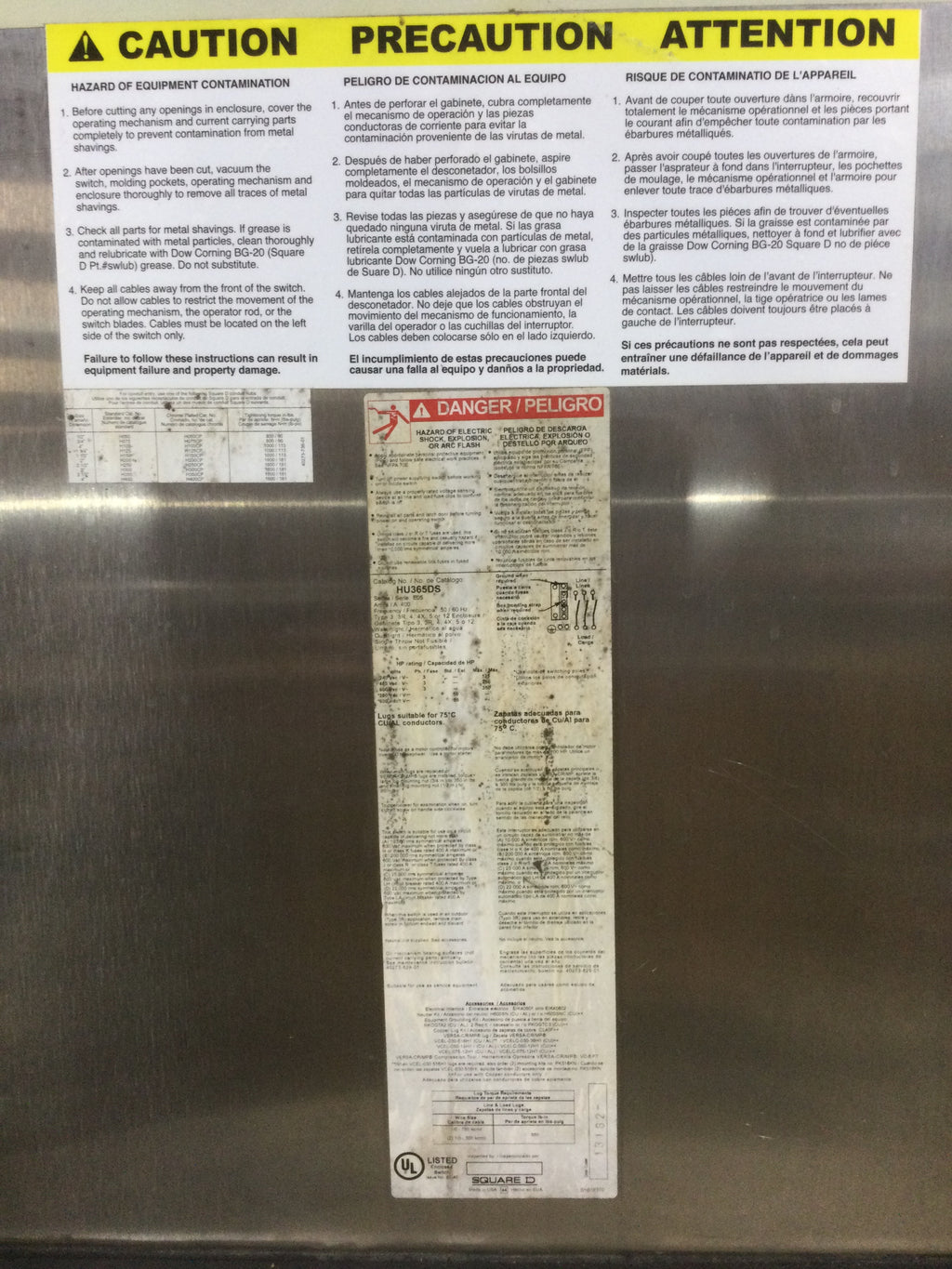 Square D HU365DS 3 Pole 400A 600VAC NEMA4/4X/5 Stainless Steel Safety Switch/Disconnect