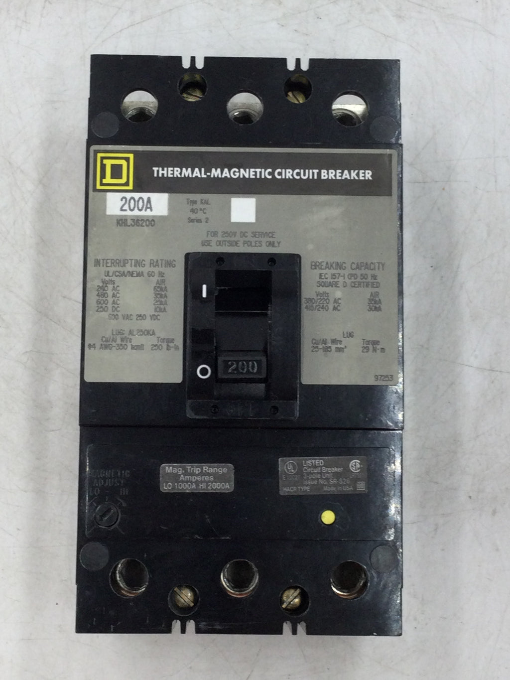 Square D KHL36200 200 Amp 3 Pole 600V Thermal Magnetic Circuit Breaker