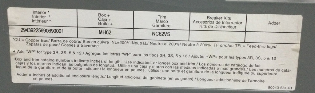 Square D NF 294392256906900001 Interior Series 400 A 480/277 3 PH 4 W 30 Space in Box MH62