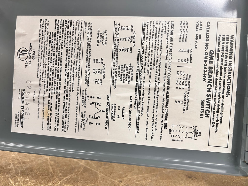 Square D QMB-363-HW 100 Amp 600v 75 Hp Fusible Panelboard Branch Switch