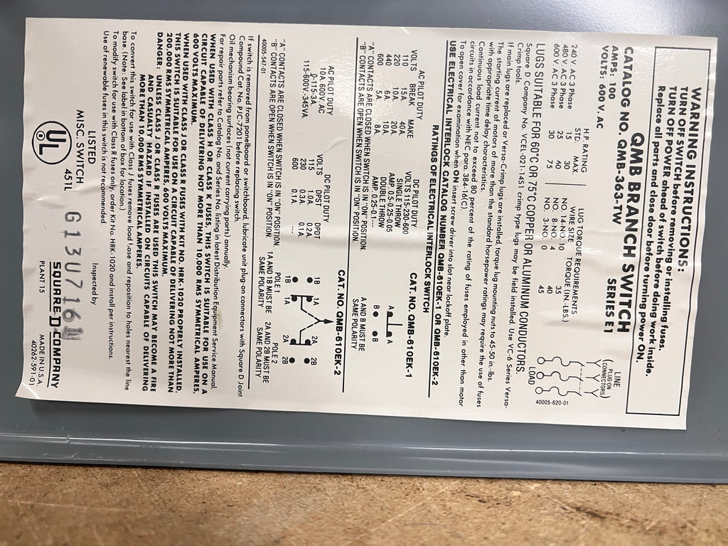 Square D QMB-363-TW 100 Amp 600v 75 Hp Twin Fusible Panelboard Branch Switches