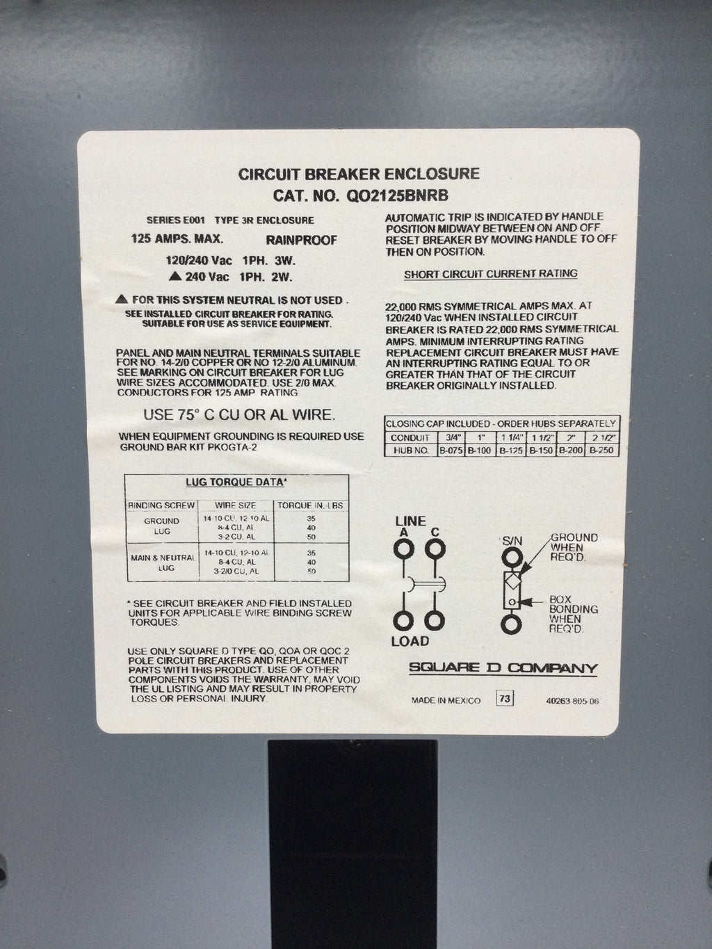 Square D QO2125BNRB 125 Amp 120/240V 1 Phase 2 Spaces Nema 3R Enclosure