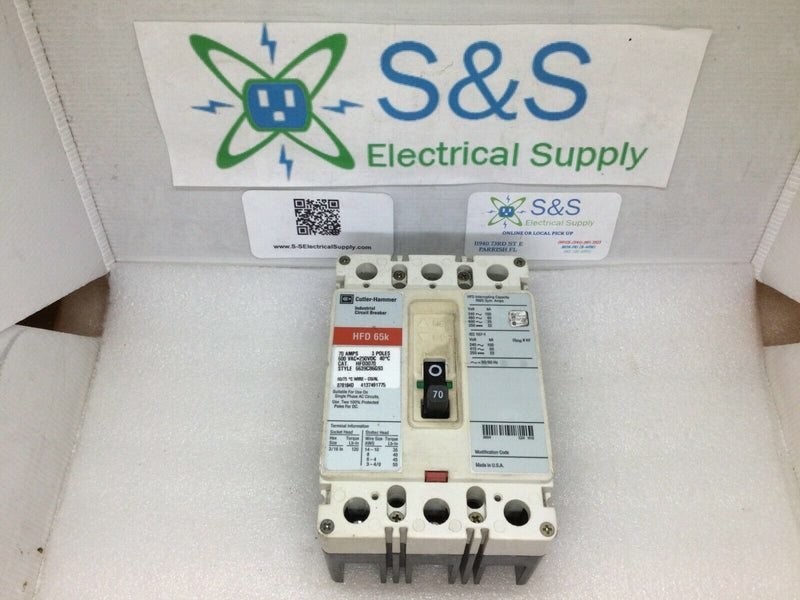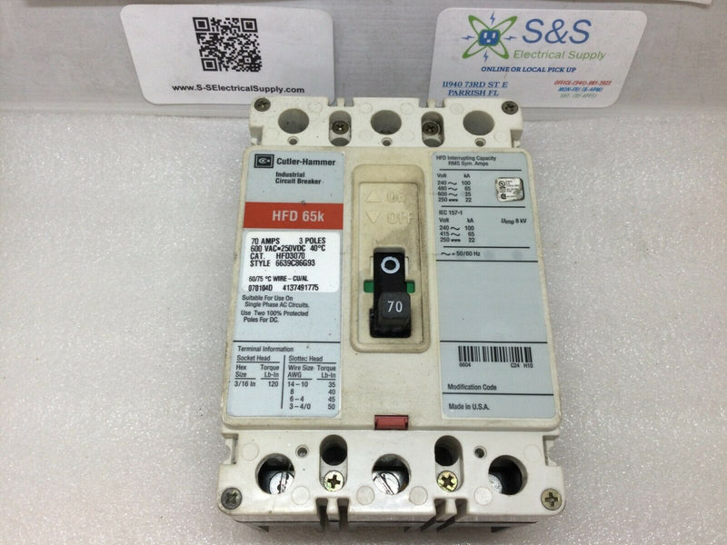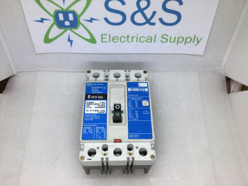 The Cutler Hammer/Westinghouse HFD3070 is a 70 Amp, 3-pole 600VAC HFD 65K Circuit Breaker. Its overload and short circuit protection make it reliable and safe to use, while its ability to withstand 65k amps of interrupting capacity ensures its reliability and durability.