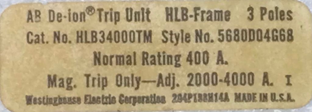 Westinghouse HLB34000TM 400 Amp 3 Pole Circuit Breaker Amp Trip Unit