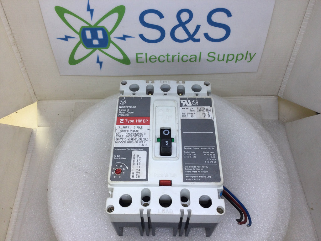 Westinghouse HMCP003A0C 3 Amp 3 Pole 600V Breaker w/Aux A1X1PK 6 Amp