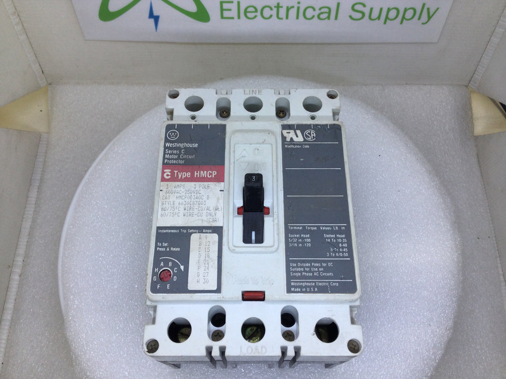 Westinghouse HMCP003A0C-B 3 Amp 3 Pole 600V Circuit Breaker