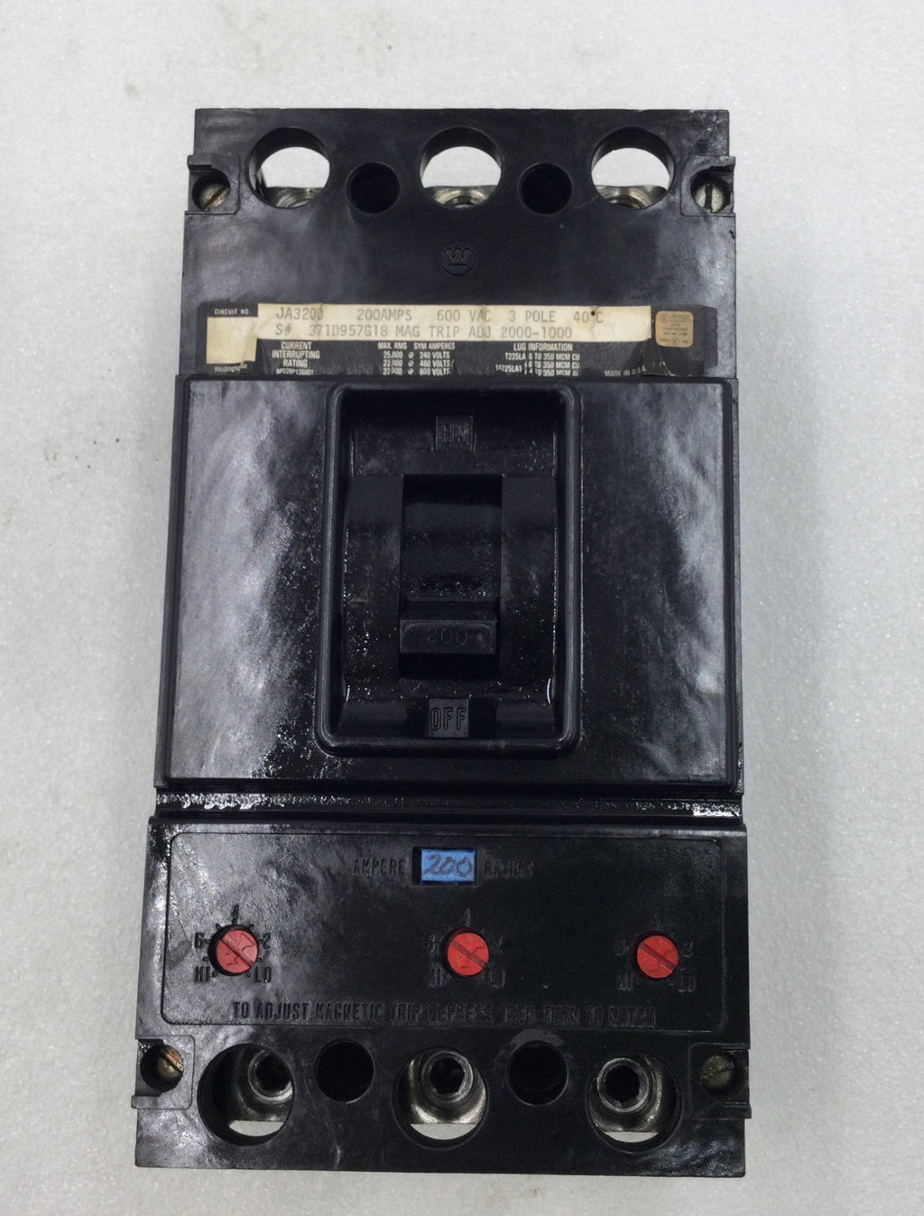 Westinghouse JA3200 200 Amp 3 Pole 600V Circuit Breaker - Cosmetic Flaw