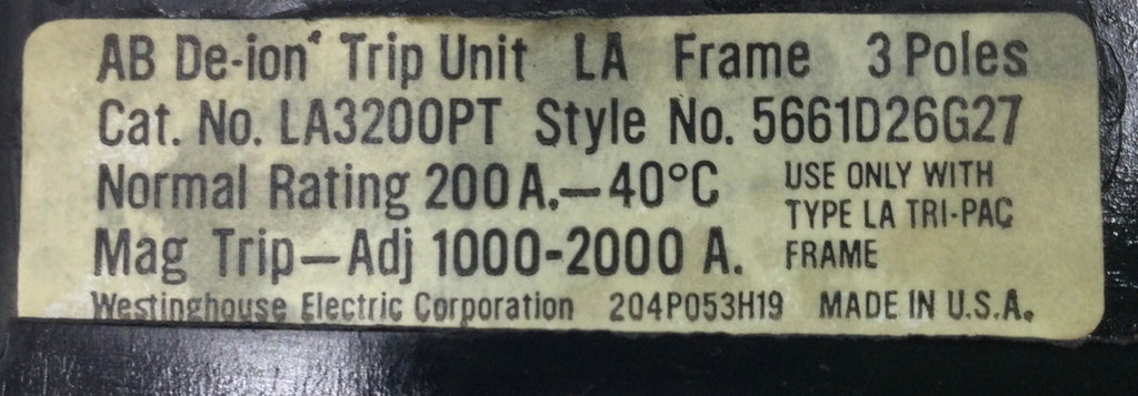 Westinghouse LA3200PT 200 Amp 3 Pole Circuit Breaker Amp Trip Unit