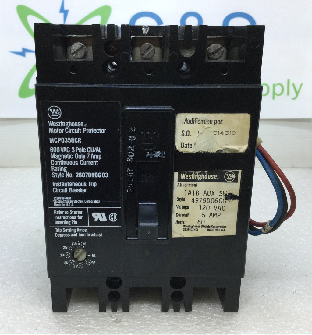 The Westinghouse MCP0358CR is a 7 Amp, 3-pole circuit breaker rated for 600V, designed for reliable protection in electrical systems. It features an auxiliary switch for enhanced control and monitoring, making it suitable for complex industrial or commercial applications requiring precise circuit management.
