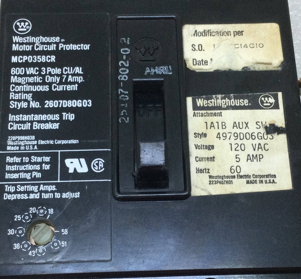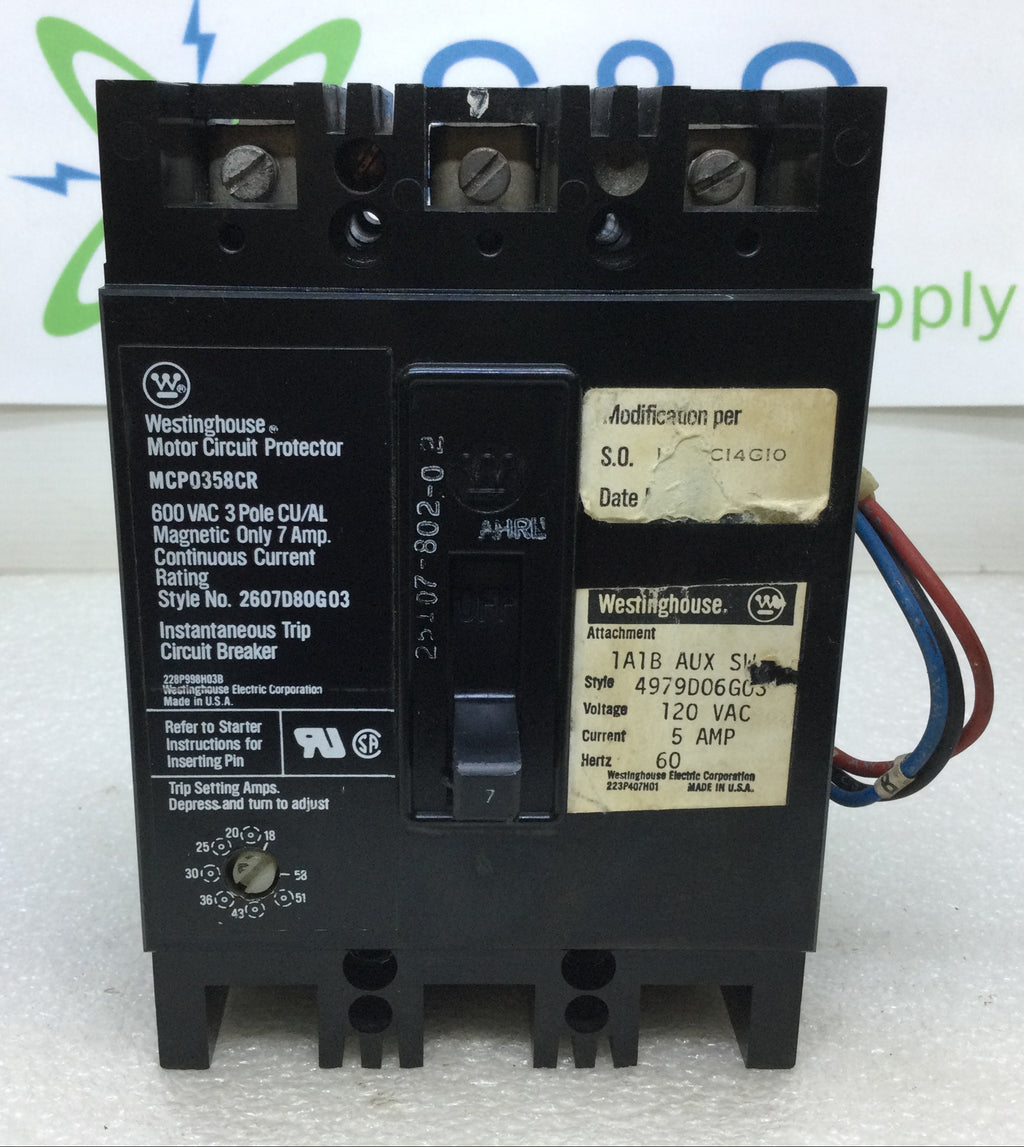 Westinghouse MCP0358CR 7 Amp 3 Pole 600V Circuit Breaker w/Aux Switch