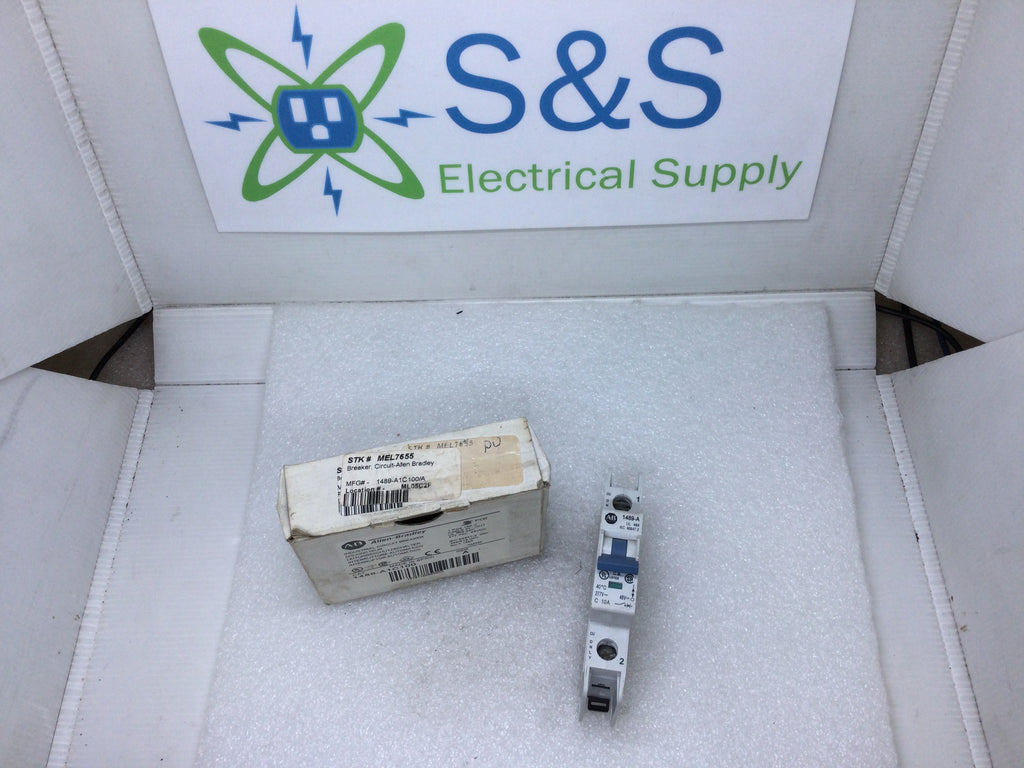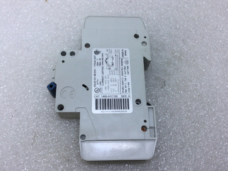 The Allen Bradley 1489A1C100 is a 1 Pole thermal magnetic molded case circuit breaker with a current rating of 10 Amps and a voltage rating of 277VAC, 48VDC. It has a din-rail mounting type.