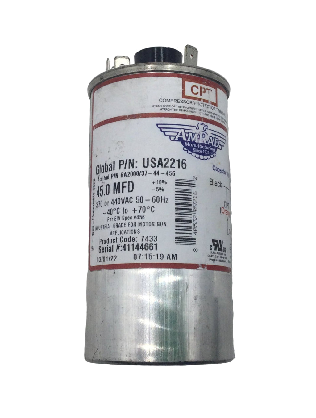 The Amrad USA2216 capacitor offers a 45.0 MFD rating with a tolerance of +10%/-5%, designed for reliable operation at 370/440VAC and 50/60Hz. Ideal for industrial and electrical applications requiring stable performance under variable voltage conditions, this capacitor ensures efficient energy storage and smooth operation of motors and other equipment.