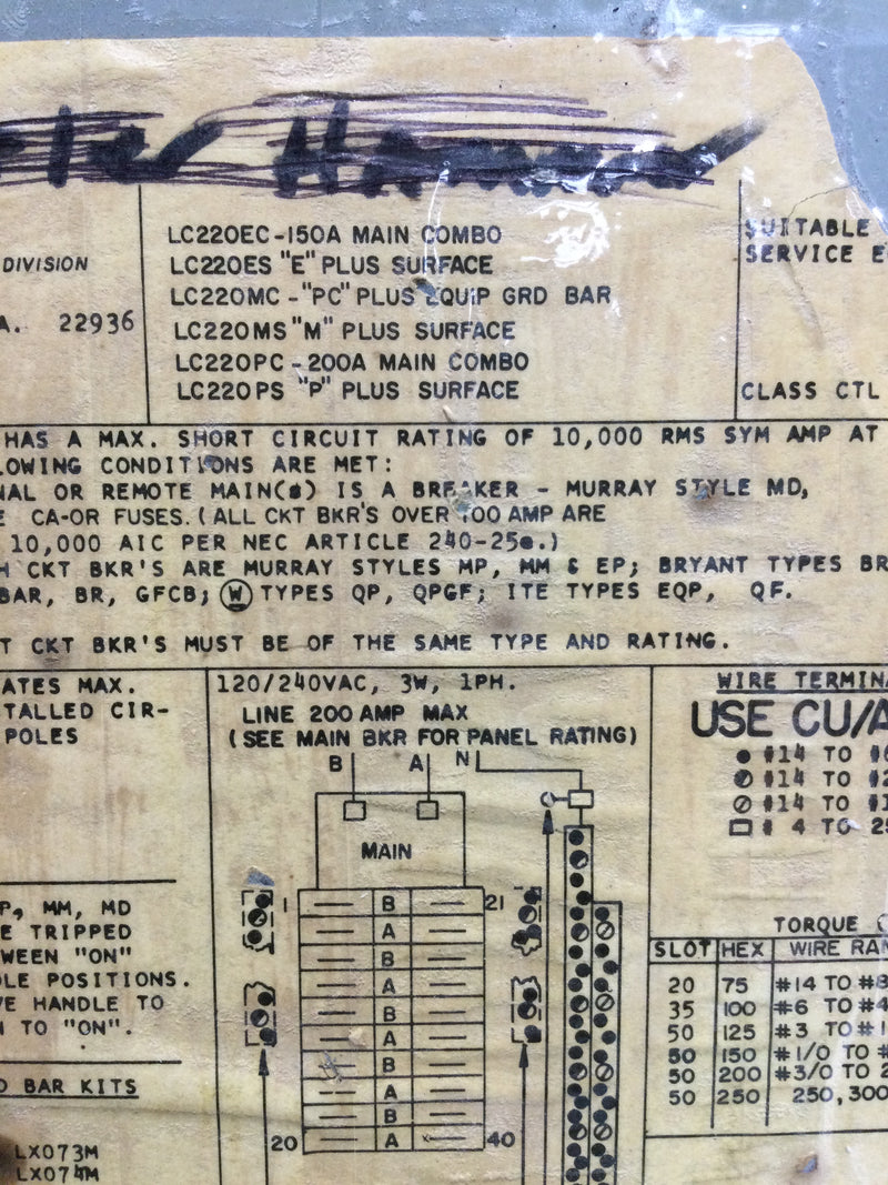Arrow Hart/Murray LC220EC 200A 20 Space 120/240V Door w/Main 21 3/8" x 14 1/2"