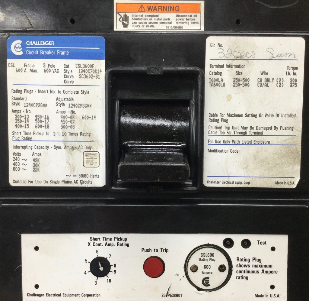 Challenger CSL3600F 600 Amp 3 Pole 600V 22K Type Circuit Breaker w/Amp Trip