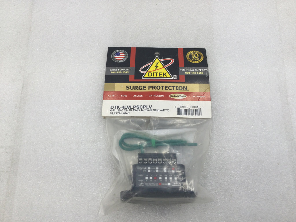 The Ditek DTK-4LVLPSCPLV surge protector is designed for 4-pair terminal strip connections with maximum voltage protection of 30V. It can handle a wide range of wire sizes, from 322 to 16 AWG, making it suitable for various applications.