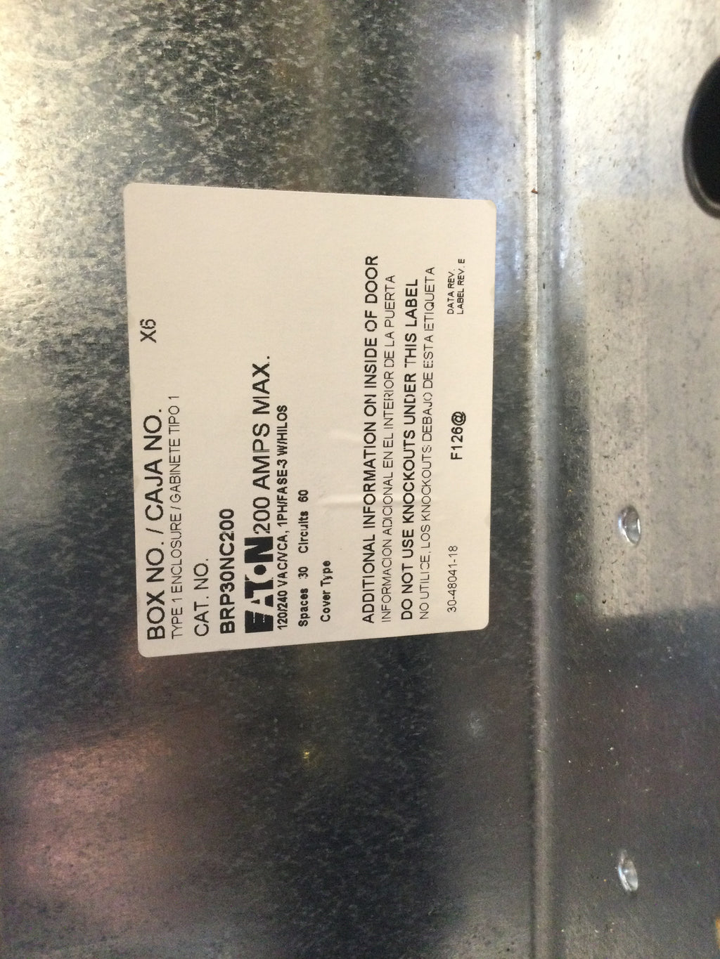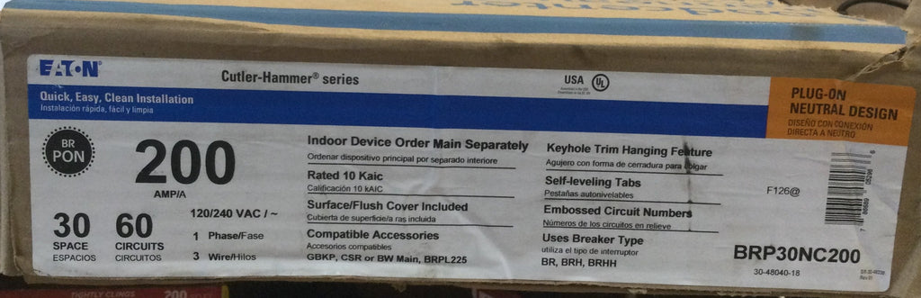 Eaton BRP30NC200 200A 30 Space 120/240V Type BR Plug On Neutral Copper Buss (New In Box)