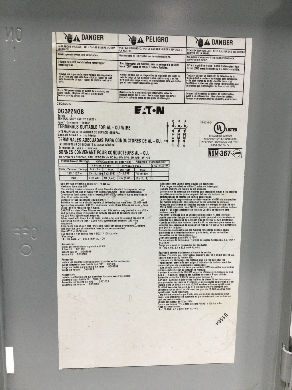 Eaton/Cutler-Hammer DG322NGB 60 Amp 240V Fusible Disconnect 14 1/4" x 9"