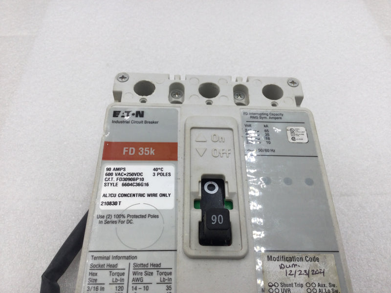 Eaton FD3090BP10 90 Amp 3 Pole 600 VAC Circuit Red Label Breaker with Shunt Trip