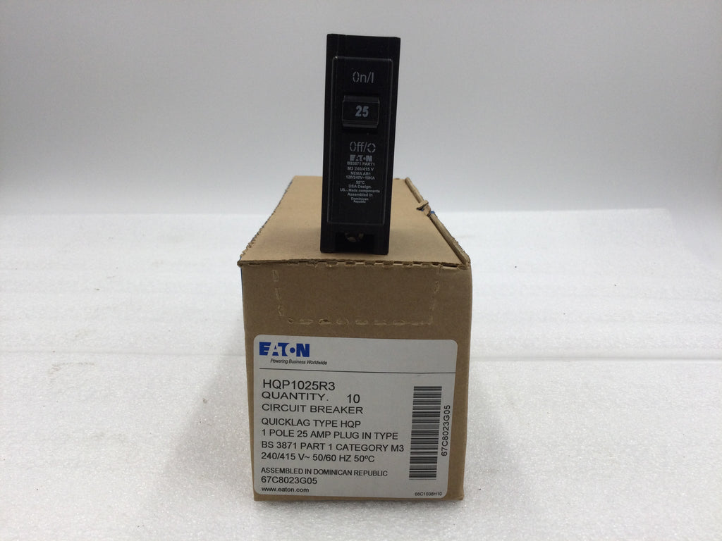 The Eaton HQP1025R3 is a 25 Amp, single-pole circuit breaker designed for 120/240V systems. Rated Type HQP, it ensures reliable overcurrent protection for residential and light commercial electrical panels. Its precise trip characteristics help safeguard wiring and connected equipment from overloads and short circuits, maintaining circuit integrity and safety.