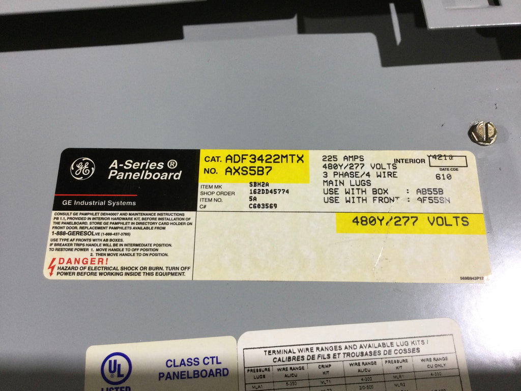 GE 225 Amp Main Lug Panelboard 42 Circuit 480Y/277 Vac 3Ø 4-Wire ADF3422MTX, AXS5B7